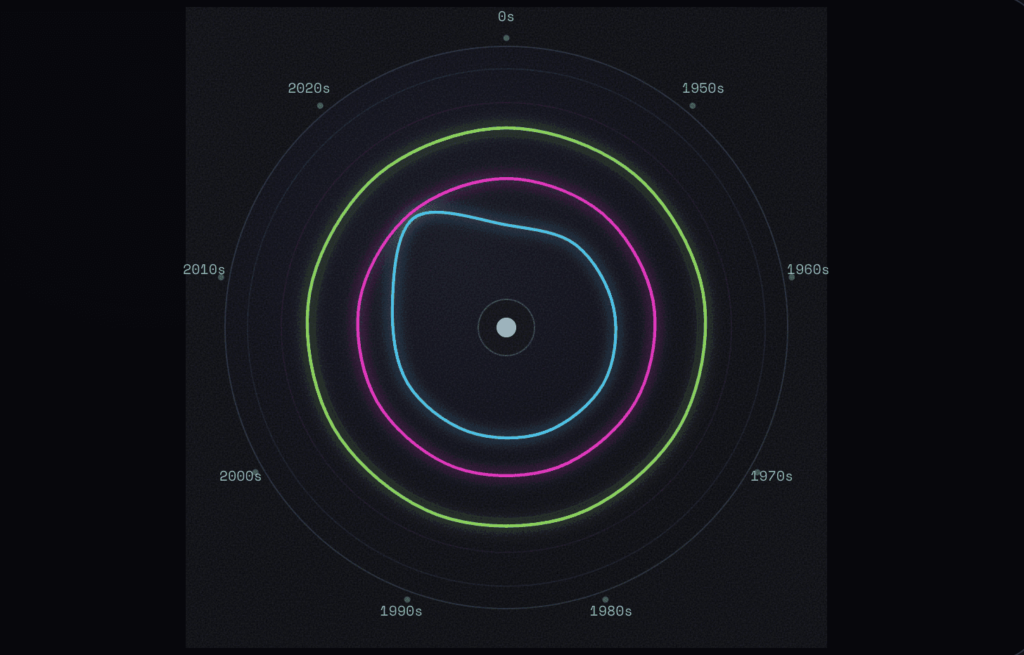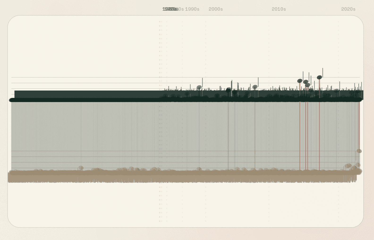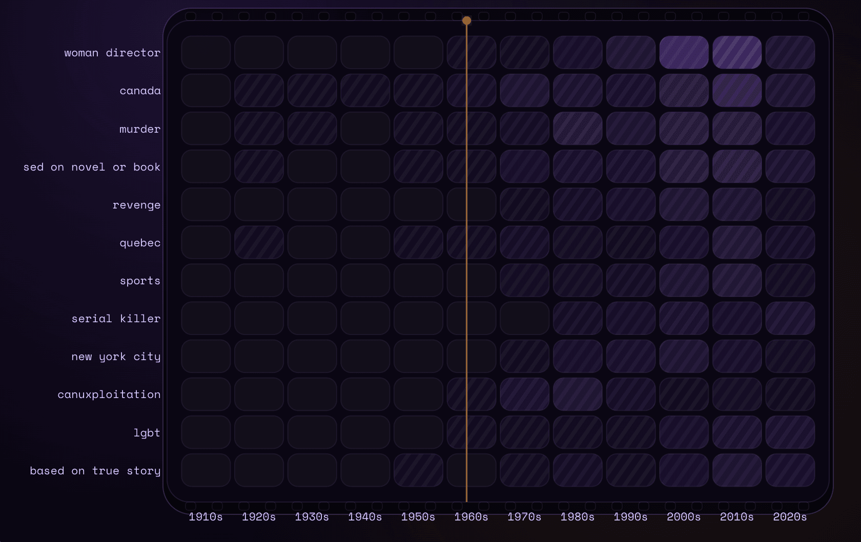 A heatmap of thematic beats showing how narrative obsessions rise and fall by decade.